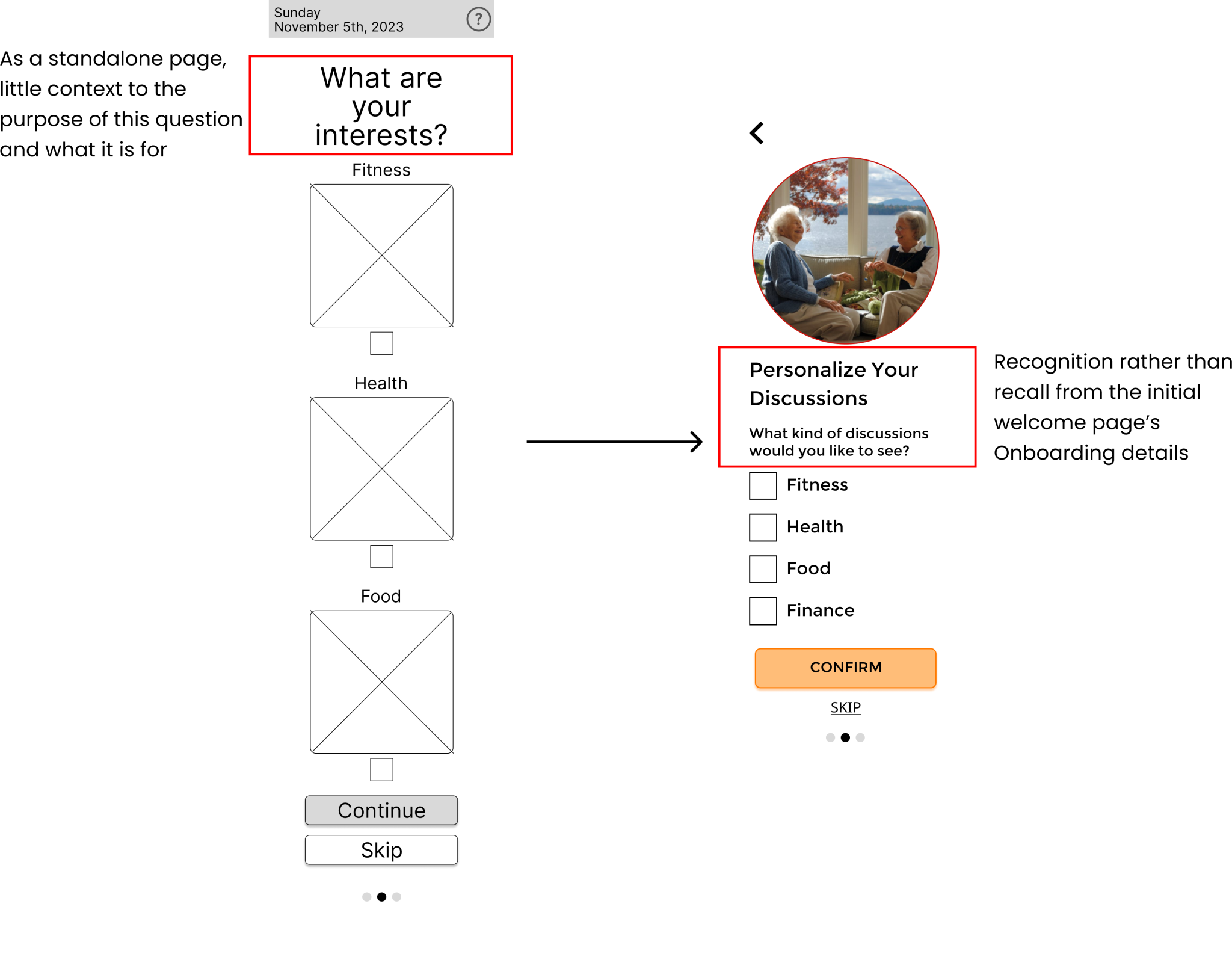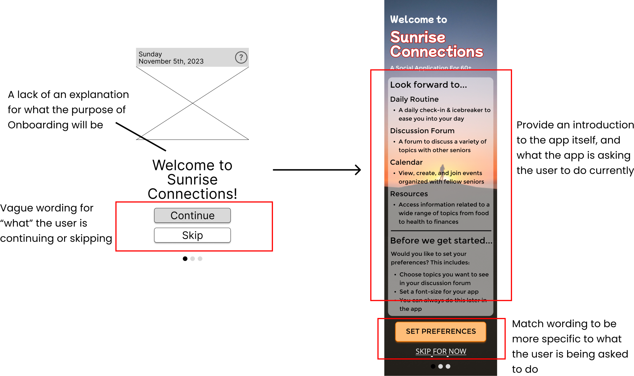 It was important to make it clear to our sponsors that our team may not be capable of producing personalization to the extent of what they requested; instead, we brainstormed a simpler form of personalization for Sunrise Connections: Onboarding.