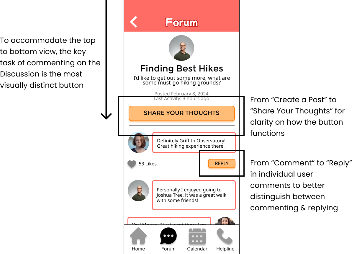 I focused on improving the visual hierarchy of the Discussion page content according to our participants’ top-bottom view, distinguishing the key tasks of commenting and replying.