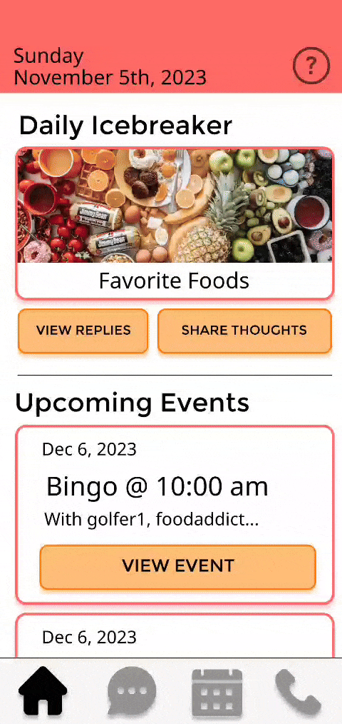 After going through the Daily Check In, elders will land on the Homepage of Sunrise Connections. There, they would find the Daily Icebreaker. The Daily Icebreaker is a daily random question prompted to users across the app, where all elders can see the same question and answer or view others’ responses. These questions would be very simple questions that everyone can talk about. The purpose of the Daily Icebreaker is to, similar to the Daily Check In, encourage elders to share their thoughts. This time, all elders are given a simple question to spark light-hearted conversation, further easing elders into deeper social interactions in the Events or Discussion Forum features.