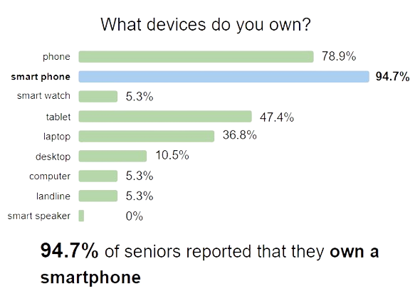The other platforms we observed, SilverSurfers and SeniorForums, are more direct competitors to our idea, with a greater focus on community via Discussion Forums. This lined up with one of the feature requirements our sponsor initially provided, but we recognized was that there was a clash with the research we personally conducted. Our research showed us that of the participants we surveyed, 94.7% of the elders owned a smartphone when questioned about what kinds of technology they had. With this in mind, we felt that this further validated our idea to create a social app that is mobile-focused for elders.