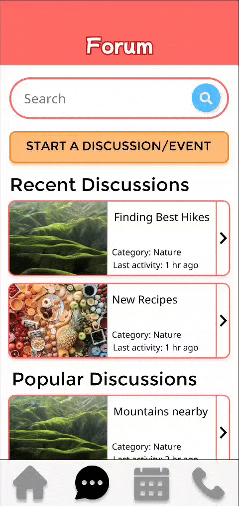 Initially, with the bottom navigation bar in mind, the Homepage would consist of brief summaries of different features, showing things such as “Trending Discussions” and “Upcoming Events”. However, the concern came up that making the homepage too complicated may confuse elders in the purpose of the app, as that’s the first page they would see upon opening the app. As a team, we decided to, for now, continue designing both forms of navigation as we move into mid-fidelity wireframes, and to test both designs in usability testing. Testing of navigation will be found in below sections.